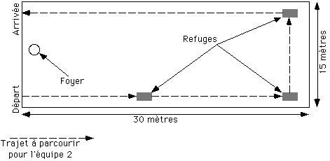 | Les joueurs se divisent en deux équipes. La première se répartit sur un terrain d’environ 30 mètres sur 15. On place des “refuges” comme indiqué sur le schéma à l’aide d’un piquet, de tapis ou de ficelle. L’équipe 2 se place au départ, en dehors du terrain. Le premier joueur de cette équipe lance (ou shoote, cela dépend de l’âge) le ballon. Pour que le coup soit valable, le ballon doit au moins atterrir la première fois dans le terrain. Dès que le ballon est tiré, le joueur cours au premier refuge. S’il a le temps, il peut même courir jusqu’au deuxième, au troisième, etc.Pendant ce temps, l’autre équipe doit ramener le ballon au “foyer”. Quand un joueur s’empare du ballon, il ne peut plus avancer, il ne peut que le lancer à un de ses coéquipiers, ou essayer de toucher un des membres de l’équipe 2 se trouvant sur le terrain, mais pas dans un refuge. Si un joueur s’est arrêté sur un refuge, il pourra repartir dès que le suivant de son équipe aura lancé la balle. Un joueur est “brûlé” lorsque la balle est revenue au foyer (l’équipe crie alors “Balle brûlée”) alors qu’il n’était pas sur un refuge, ou s’il se fait toucher par le ballon alors qu’il n’est pas dans un refuge.Un joueur qui a quitté son refuge ne peut pas y retourner, il doit atteindre le suivant.Un joueur “brûlé” rejoint son équipe au départ, et ne marque aucun point. Un joueur ayant atteint l’arrivée en plusieurs étapes marque un point pour l’équipe. Si un joueur a réussi à faire le tour d’un seul coup, il marque trois points.Les joueurs de l’équipe deux n’ont pas le droit de sortir du terrain. |