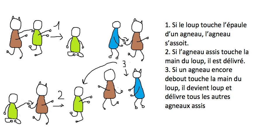 3. Si un agneau encore debout touche la main du loup, il devient loup et délivre tous les autres agneaux assis
