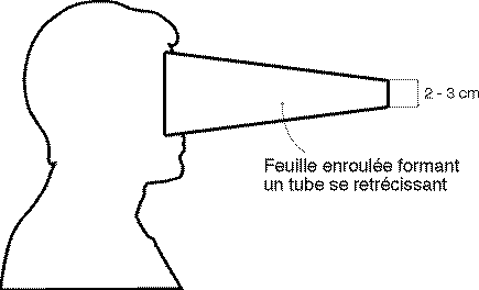 | Tout d’abord il s’agit de construire le cône en papier comme indiqué sur le schéma. La personne qui a le cône sur les yeux ne doit pouvoir voir que pas le petit trou du bout. Le but du jeu sera de pousser la balle de tennis avec le pied jusqu’à l’arrivée en un temps déterminé. Pour cela, on forme des équipes de deux. Un des joueurs met le cône devant les yeux. Ensuite, il doit essayer de shooter la balle en s’aidant des conseils de son coéquipier.La balle doit effectuer un certain parcours. Par exemple, si on est en forêt, on utilisera les arbres, les bâtons pour définir par où * la balle devra passer.Plus le terrain est accidenté, plus c’est drôle. |